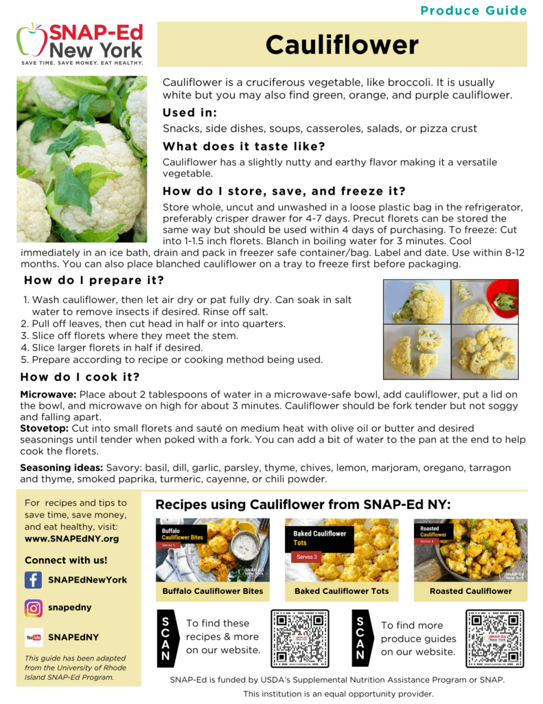 Cauliflower is a cruciferous vegetable, like broccoli. It is usually white but you may also find green, orange, and purple cauliflower.